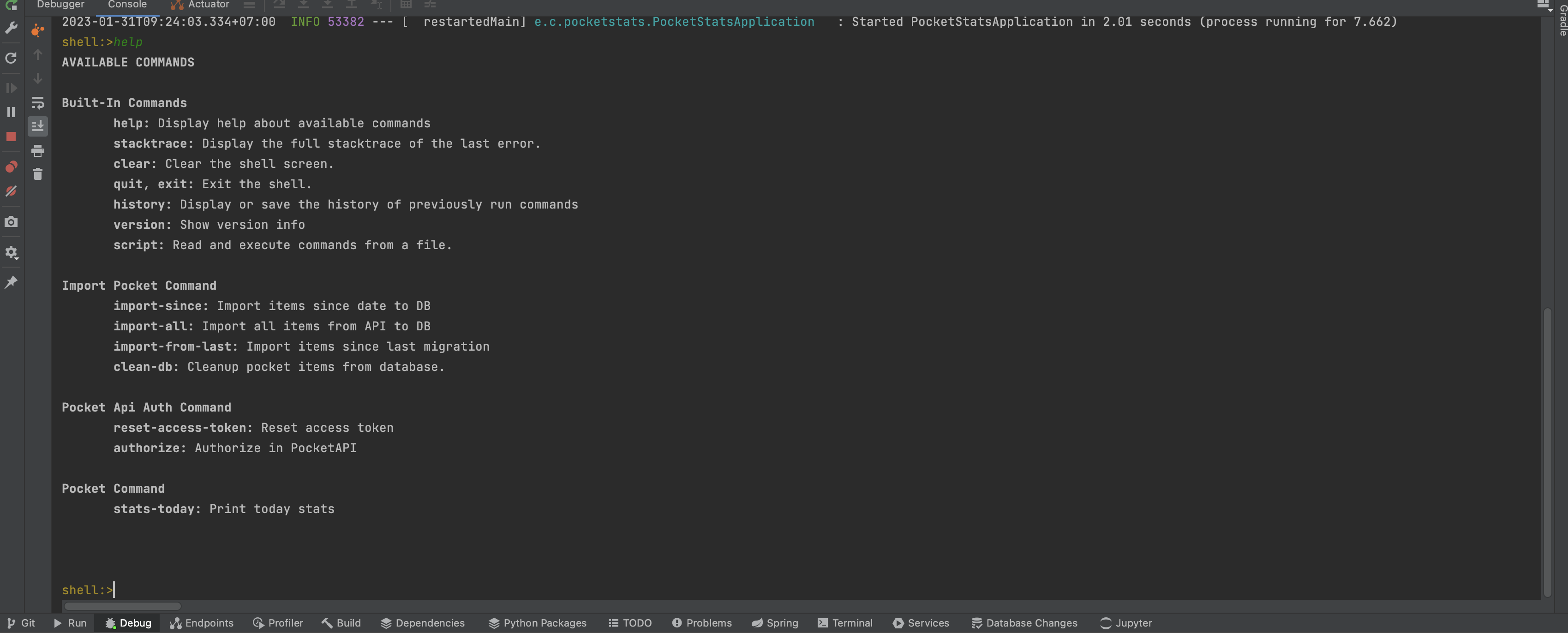 I decided to develop the app as a CLI application in the MVP version. This requires less work than creating a front end or designing endpoints under REST. I used Spring Shell to handle the commands. When you launch the application, a prompt appears in the console where you type commands.